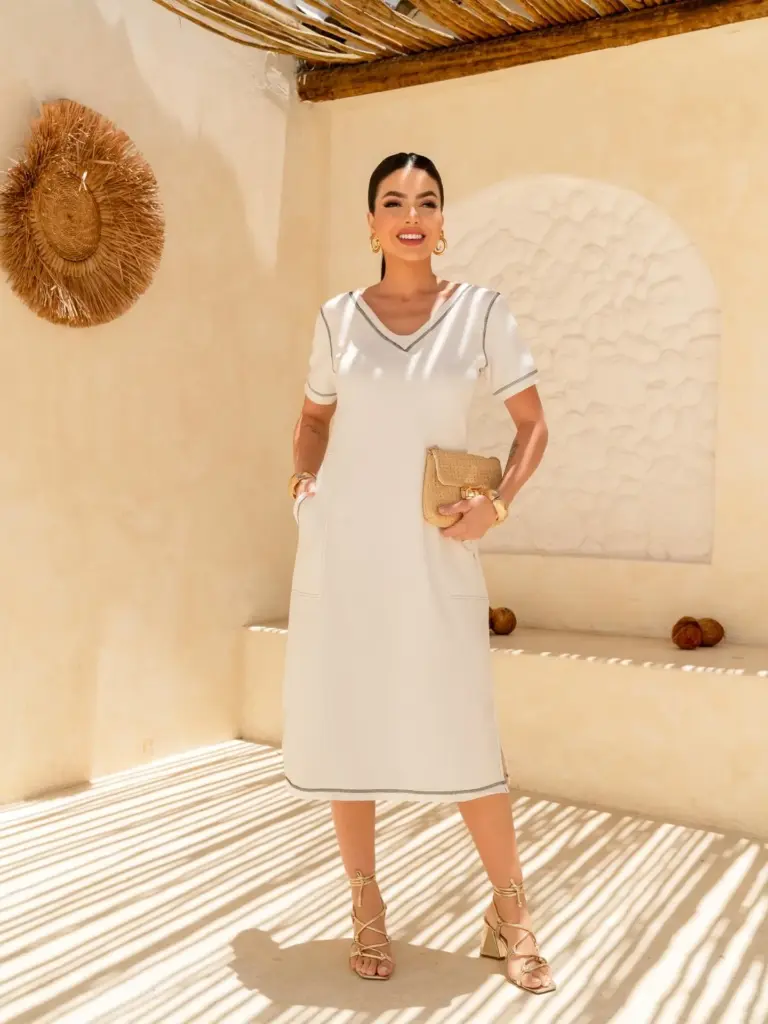 A marca trabalha com uma grade abrangente que vai do P ao GG, focando em modelagens que se adaptam e valorizam diferentes biotipos femininos.